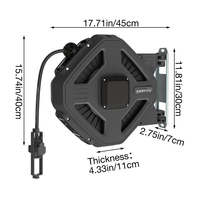 The electric hose reel features a motorized mechanism that automatically rewinds the hose with the push of a button. This eliminates the hassle of manual winding and saves you time and effort, making cleanup quick and easy.