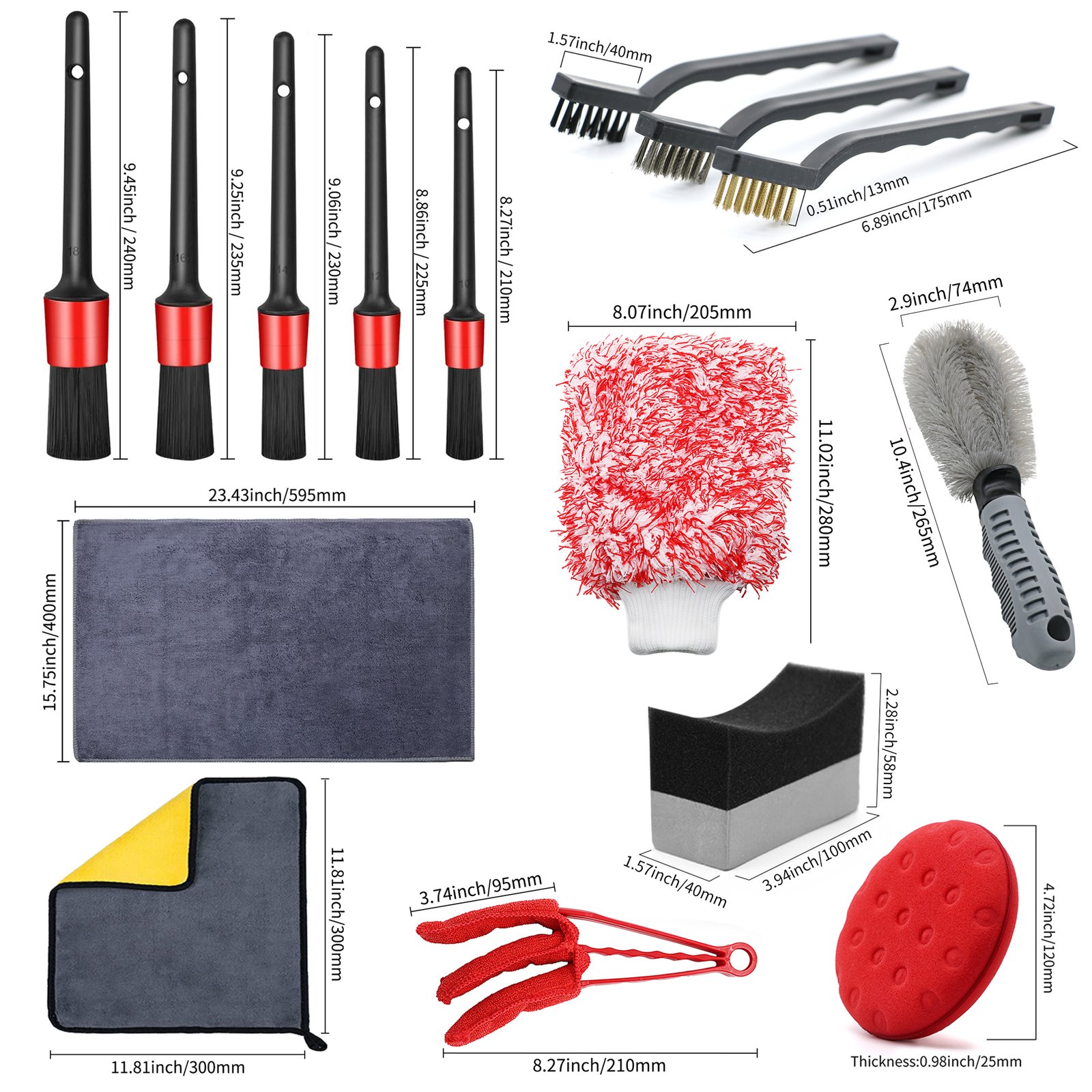 Multiple Sizes and Shapes: The set includes brushes in various sizes, shapes, and bristle types, making it perfect for tackling different areas of your car. Smaller brushes are great for vents, seams, and cup holders, while larger brushes handle areas like seats, tires, and floor mats.