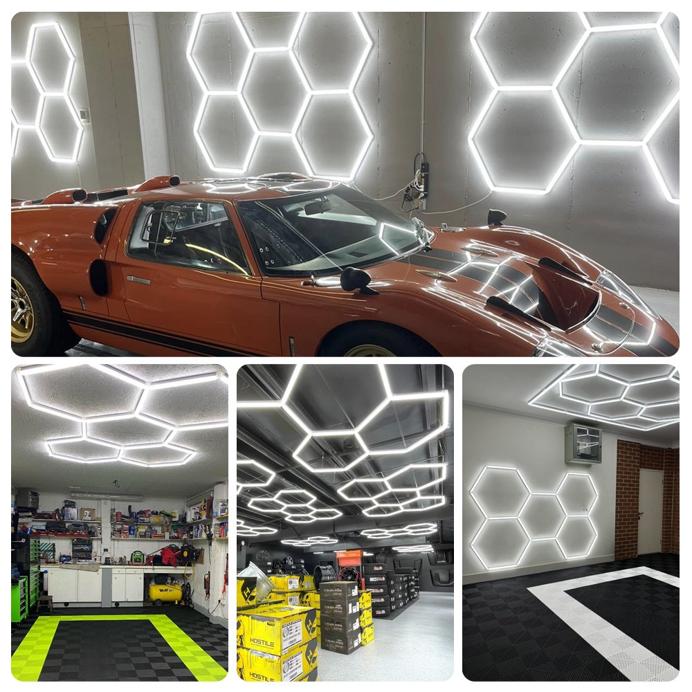 LED hexagonal lighting is versatile and can be used for a variety of scenes, including automotive shops, auto body shops, auto detailing shops, auto repair shops, car wash shops, workshops, garages, showrooms, gyms, ceiling, gaming, wall, barber shop, supermarket and more.