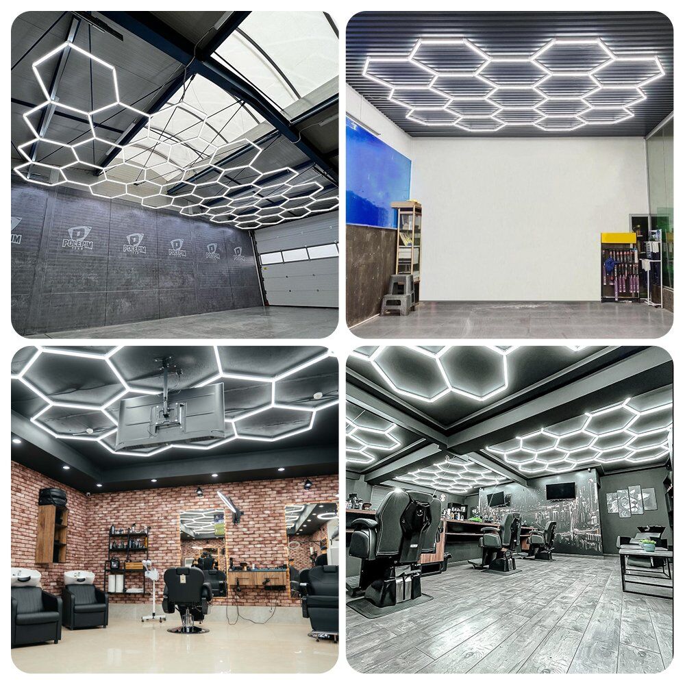 LED hexagonal lighting is versatile and can be used for a variety of scenes, including automotive shops, auto body shops, auto detailing shops, auto repair shops, car wash shops, workshops, garages, showrooms, gyms, ceiling, gaming, wall, barber shop, supermarket and more.