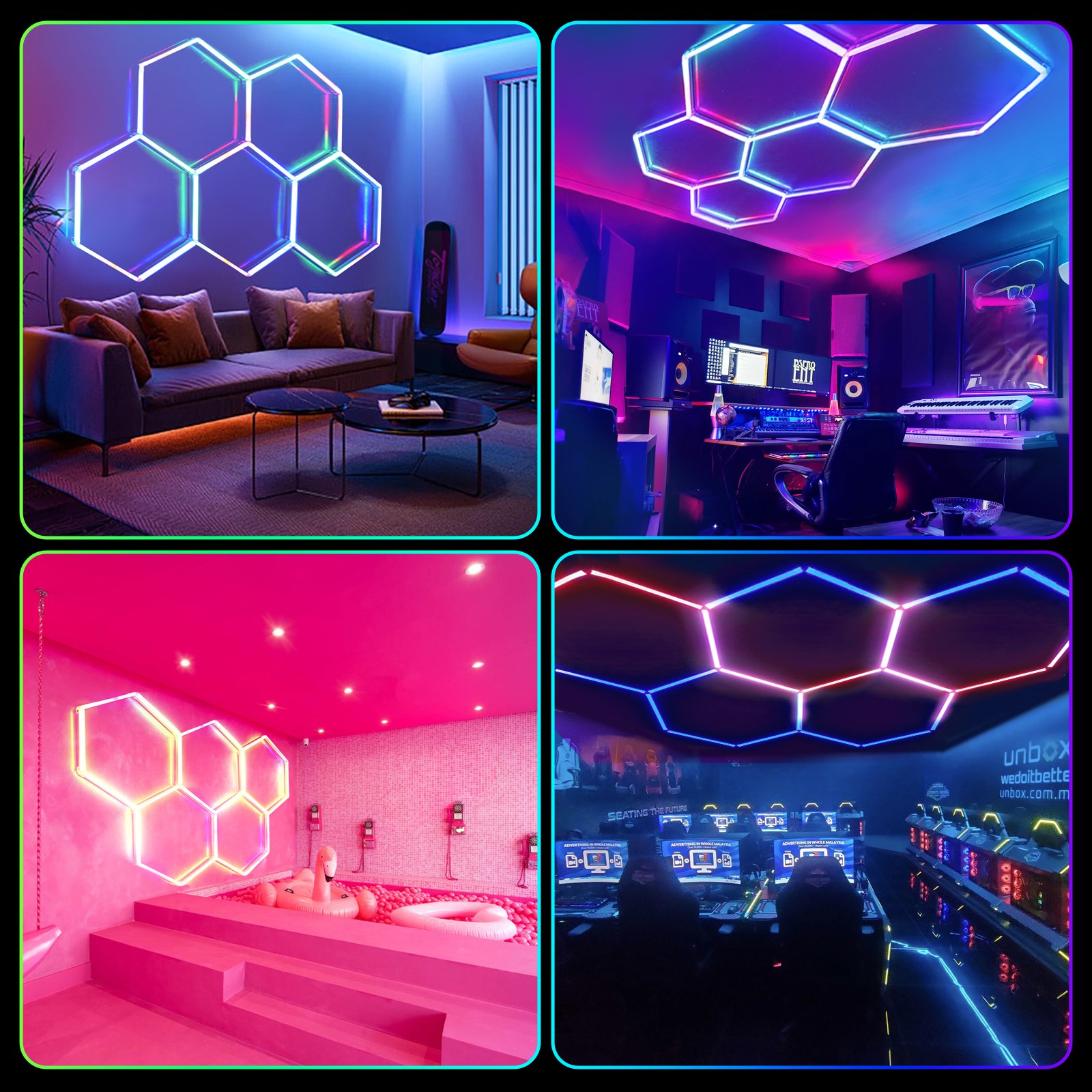 LED RGB hexagon lights are versatile and can be used for various scenes, including home parties, entertainment stages, bars, gaming rooms, gyms, showrooms, ceilings, walls, barber shops, supermarkets, and more.